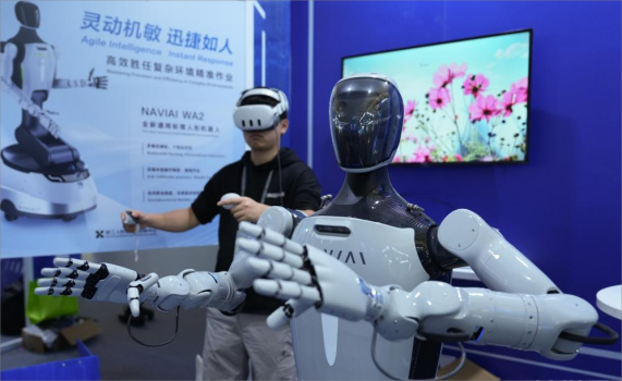 在2025年世界互联网大会“互联网之光”博览会现场,人形机器人同步模仿精细动作。新华社记者 黄宗治摄